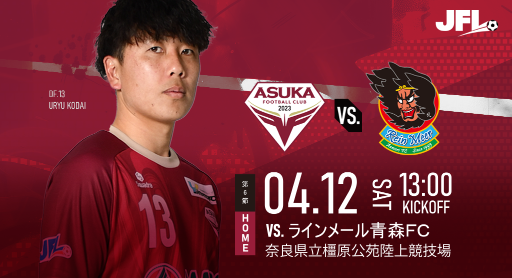 さて、4月12日(土) JFL日本フットボールリーグ第6節、飛鳥FCホームゲーム(@奈良橿原)の試合情報を以下にてお知らせいたします。