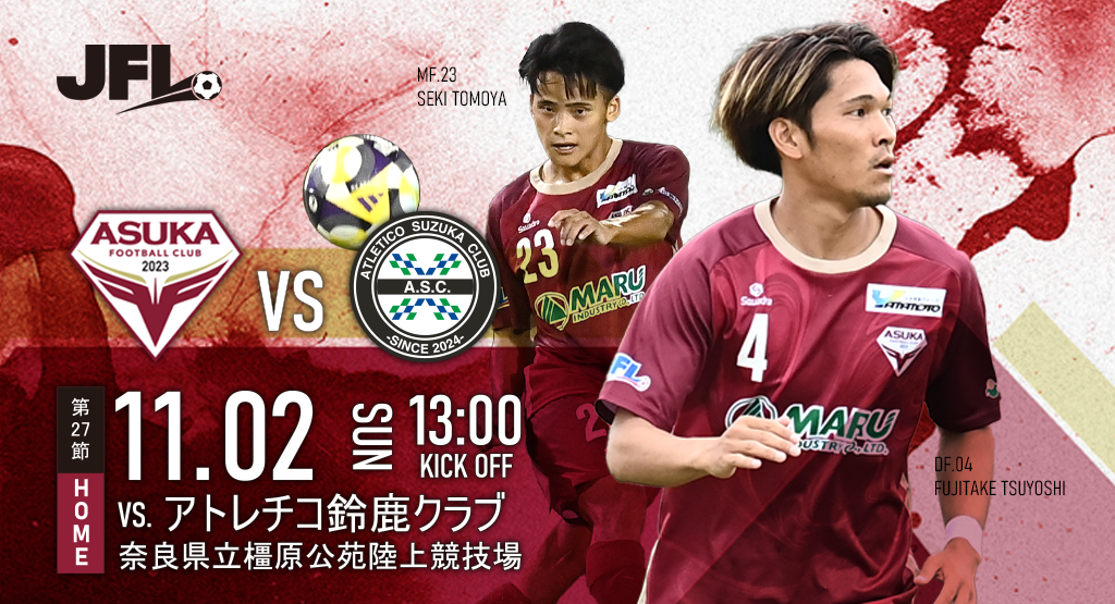 さて、11月2日(日)第27回 JFL日本フットボールリーグ第27節、飛鳥FCホームゲーム(@奈良橿原)の試合情報を以下にてお知らせいたします。