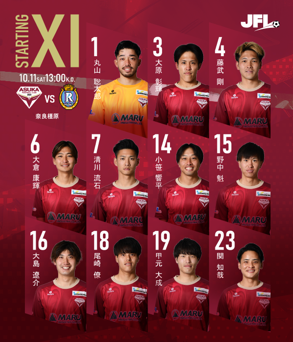 JFL第24節 VS.レイラック滋賀FC 試合結果 試合結果 10.11(土)13:00 奈良橿原 試合終了 飛鳥FC 61分 7 清川 流石 1-3 0 前半 21 後半 1 レイラック滋賀FC 10分 5 西山 大雅29分 11 三宅 海斗79分 77 北条 汰真汰
