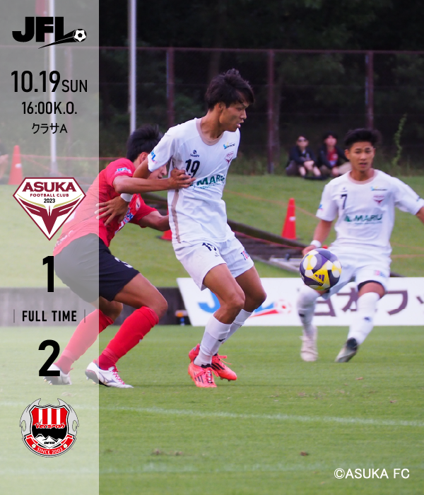 JFL第25節 VS.ヴェルスパ大分 試合結果 試合結果 10.19(日)16:00 クラサA 試合終了 飛鳥FC 13分 3 大原 彰輝 1-2 1 前半 10 後半 1 ヴェルスパ大分 45+1分 14 山崎 一帆51分 金崎 夢生(*PK)