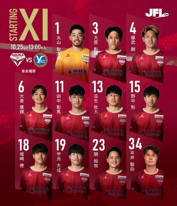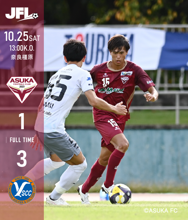 JFL第26節 VS. Y.S.C.C. 試合結果 試合結果 10.25(土)13:00 奈良橿原 試合終了 飛鳥FC 52分 15 野中 魁 1-3 0 前半 21 後半 1 Y.S.C.C.横浜 20分 37 浜下 瑛41分 59 花房 稔62分 37 浜下 瑛